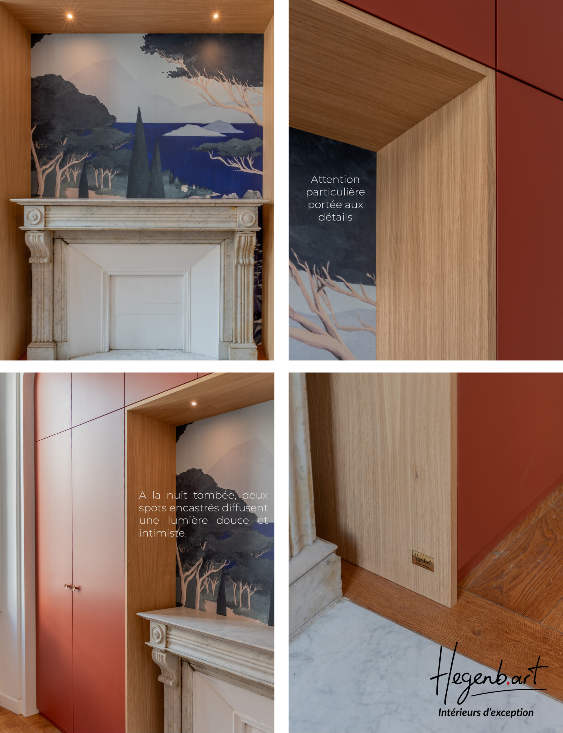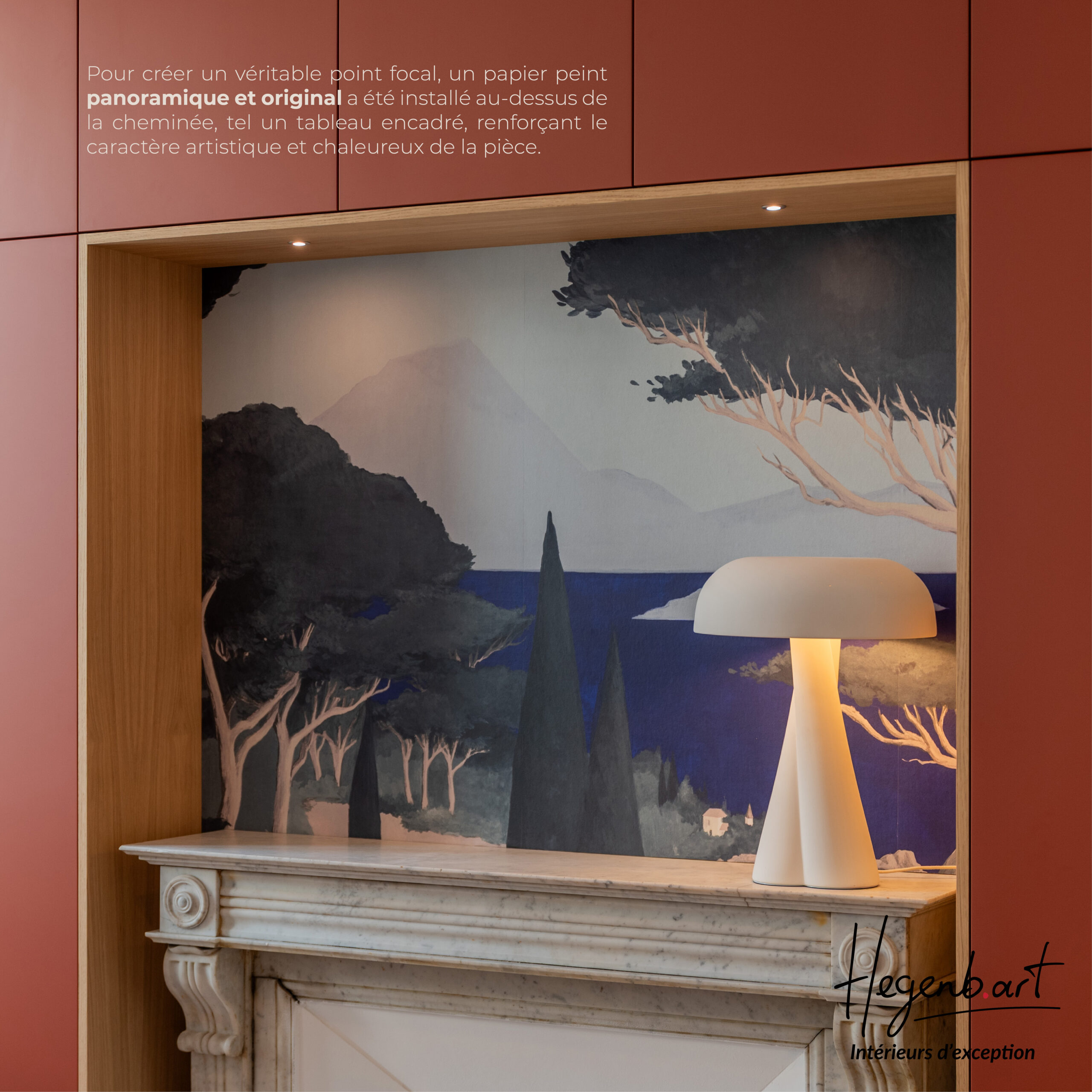 Pour créer un véritable point focal, un papier peint panoramique et original a été installé au-dessus de la cheminée, tel un tableau encadré, renforçant le caractère artistique et chaleureux de la pièce.