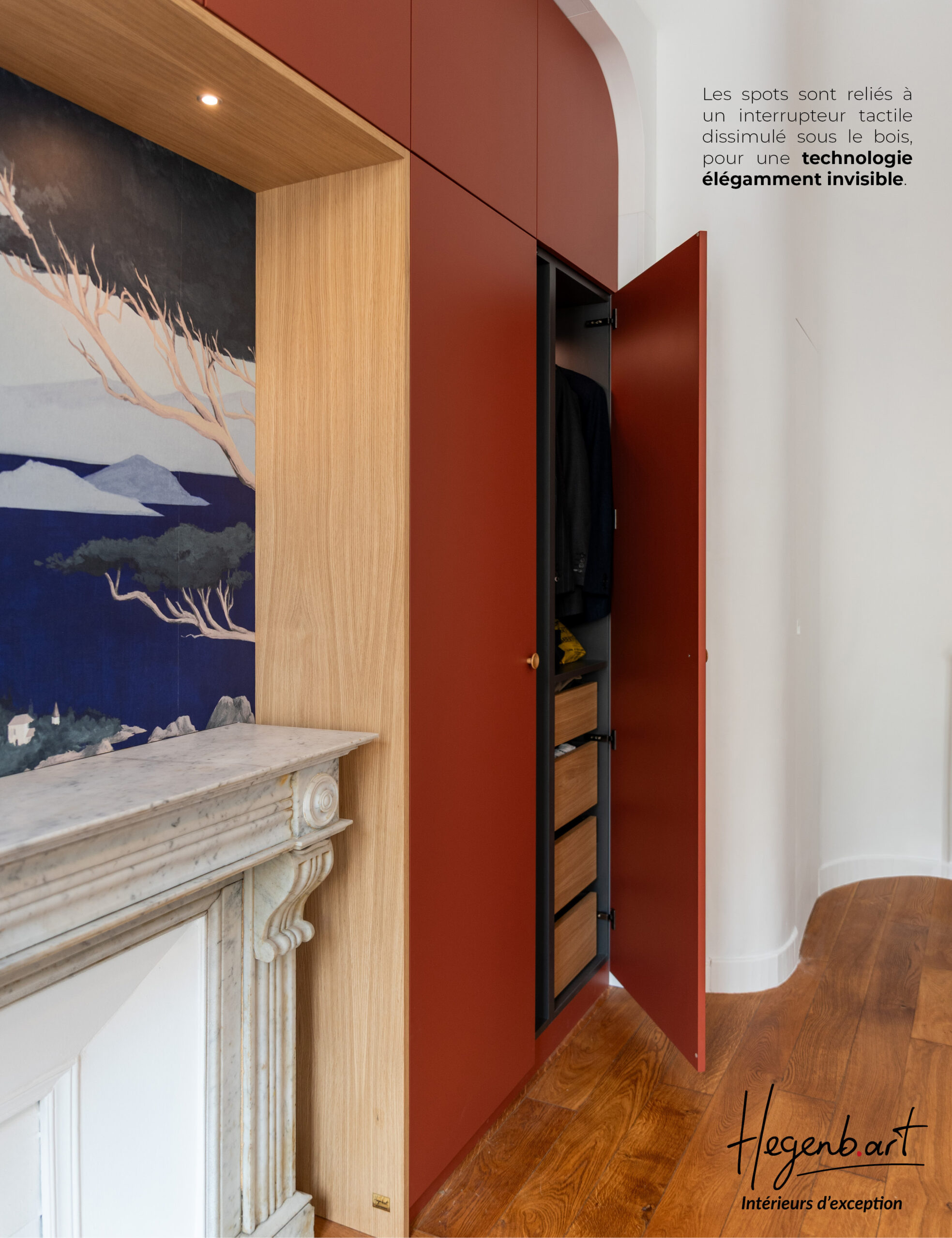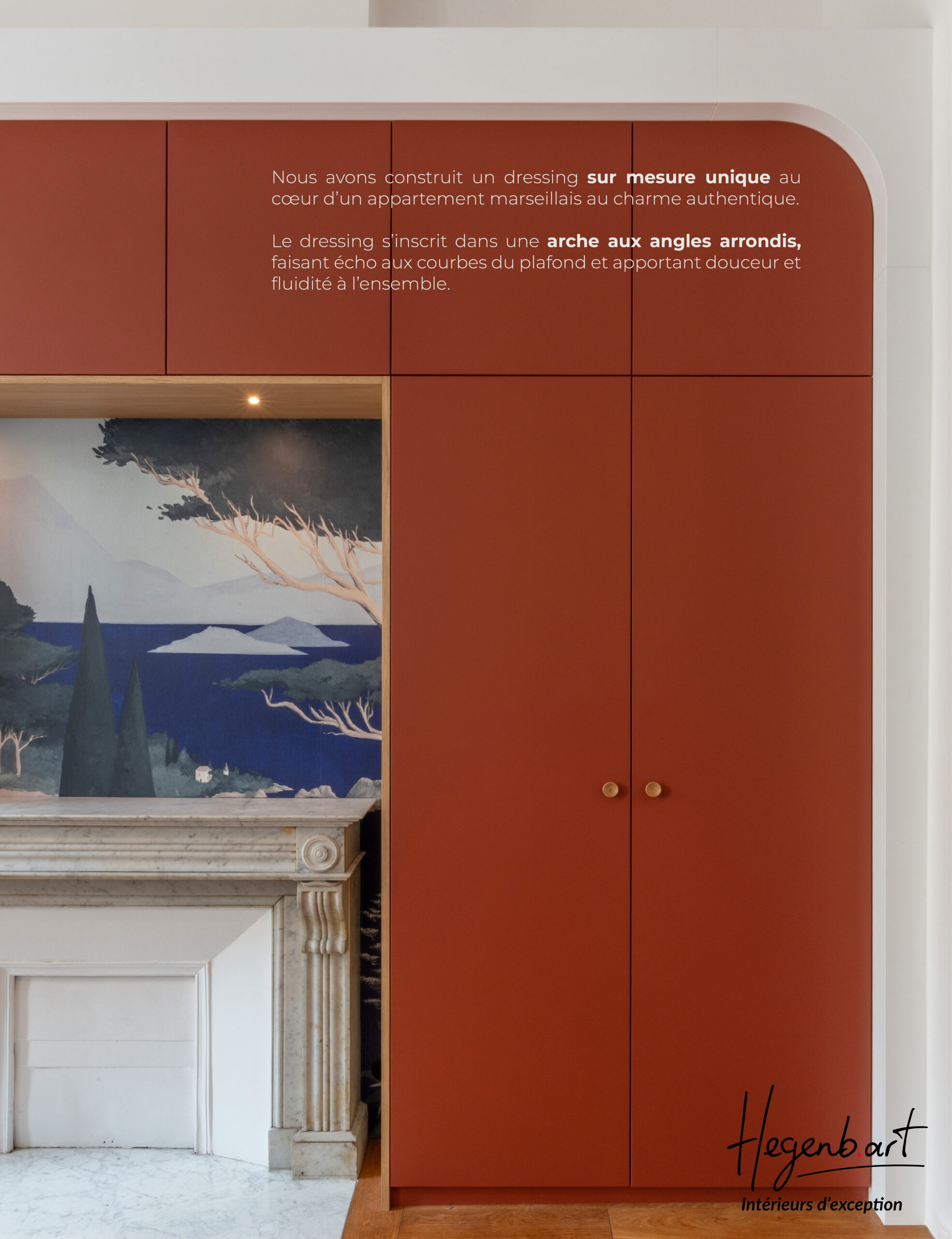 Le dressing s’inscrit dans une arche aux angles arrondis, faisant écho aux courbes du plafond et apportant douceur et fluidité à l’ensemble.