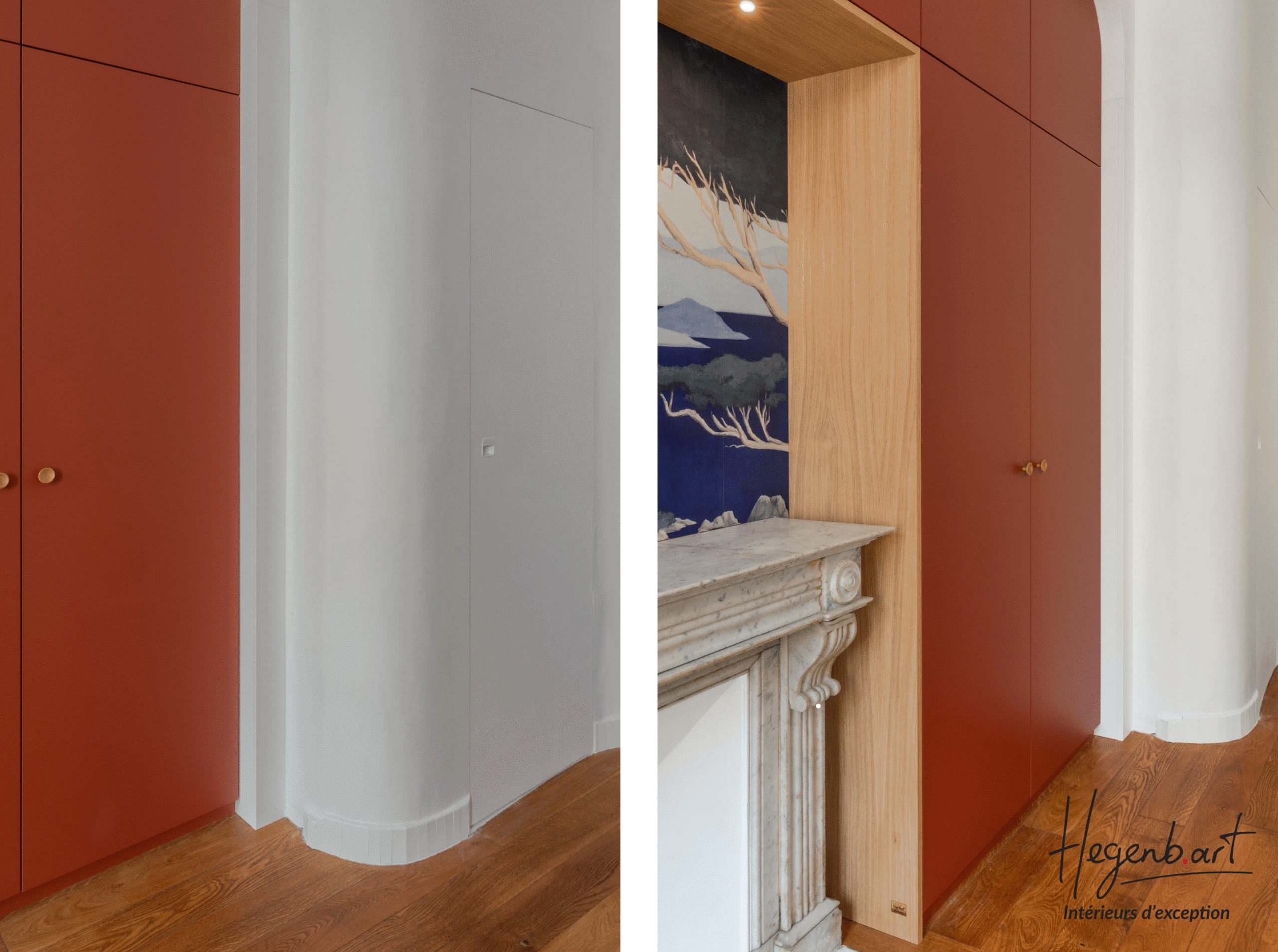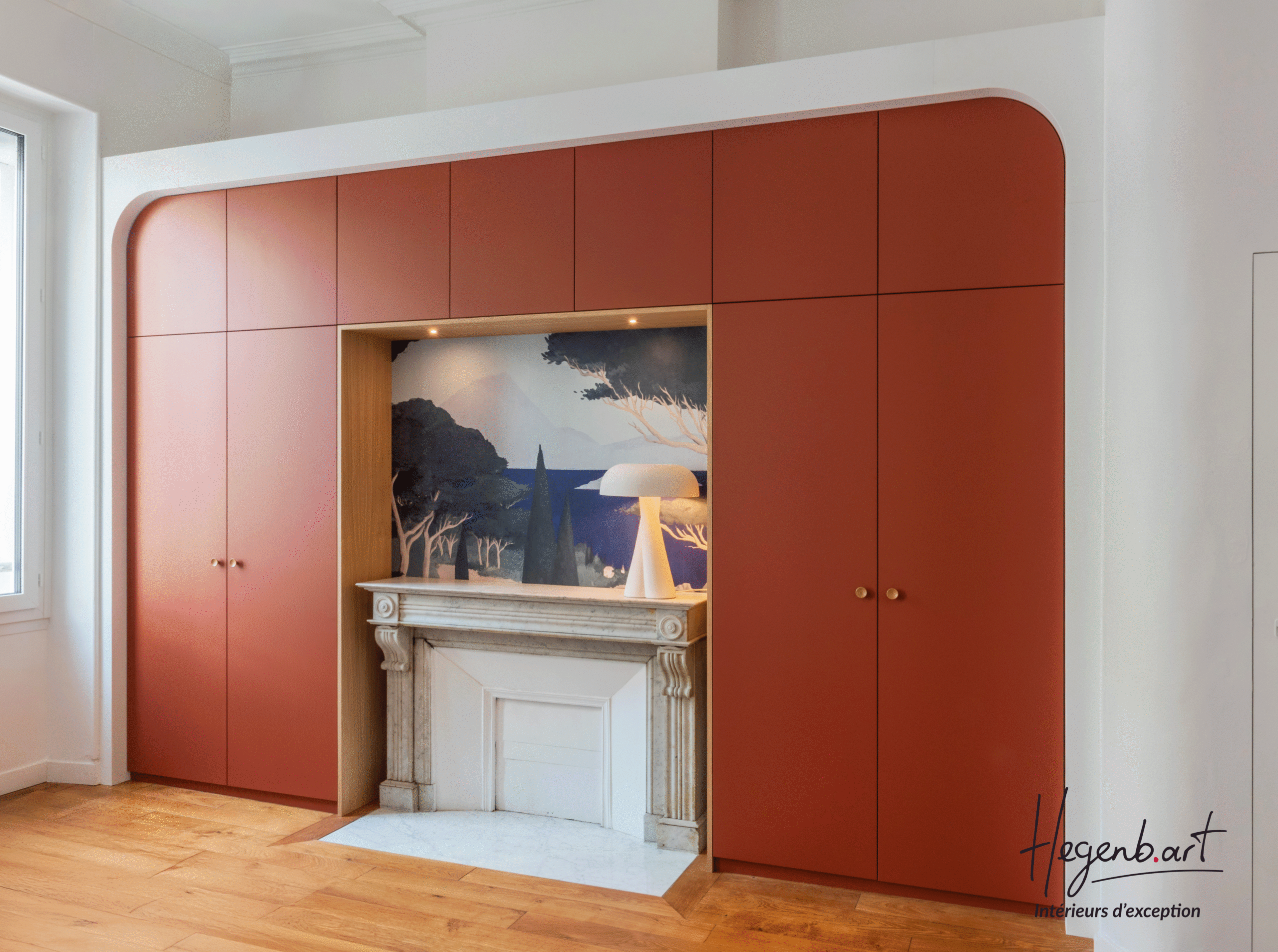 Façades : bois laqué coloris terracotta foncé, une teinte chaude et enveloppante, en écho aux tomettes de l’appartement ancien