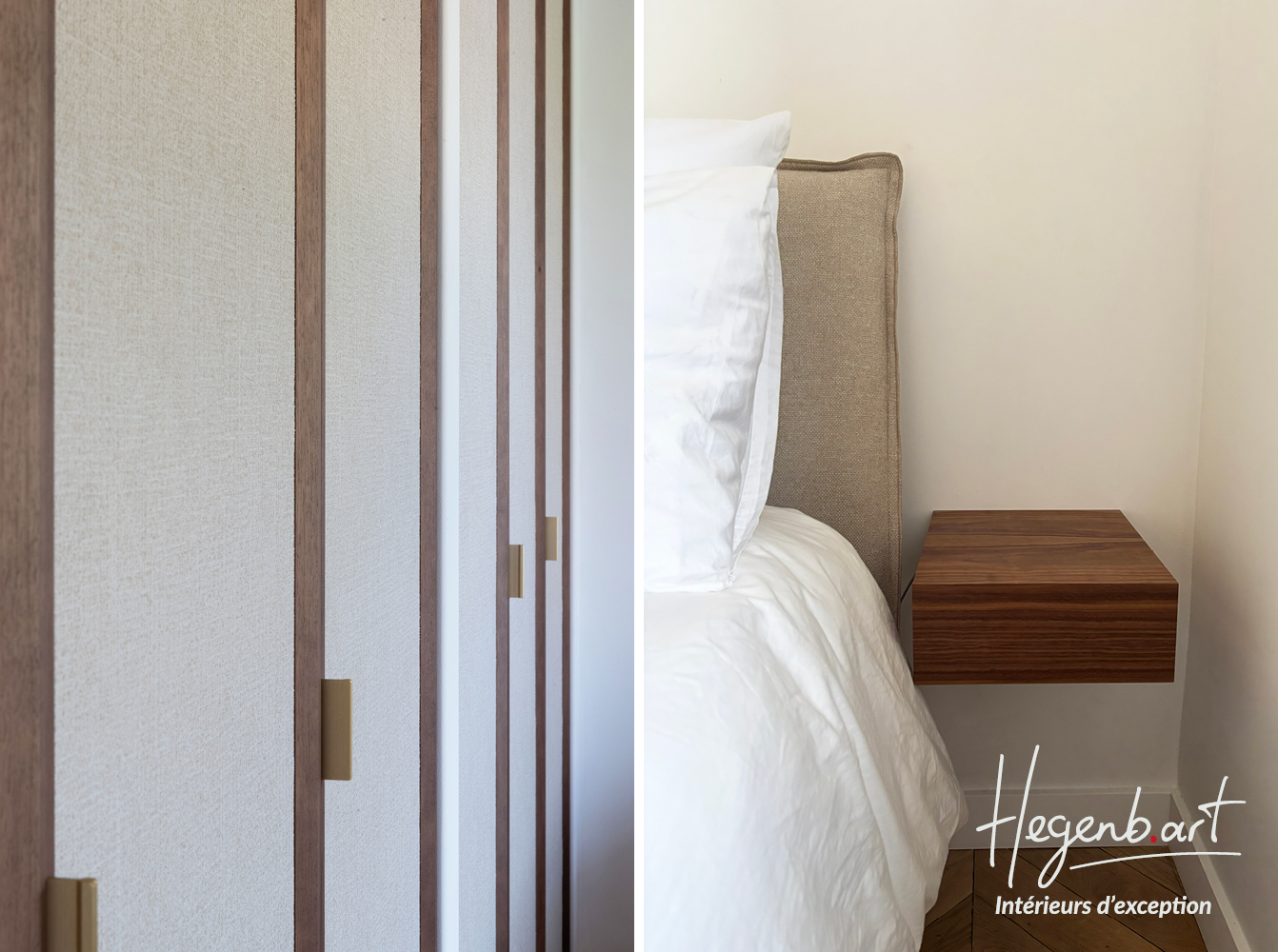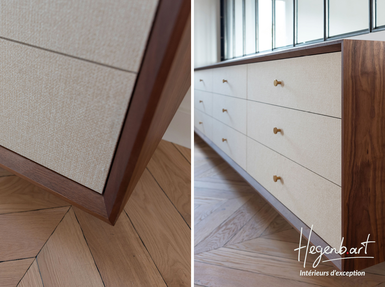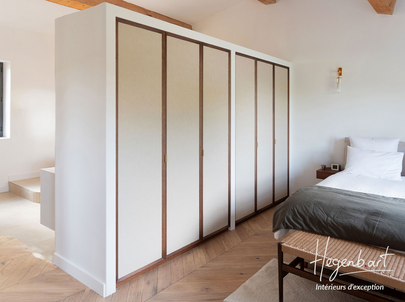 Un grand cadre en noyer massif vient entourer les façades en tissu doré Rubelli, rappelant le dressing.