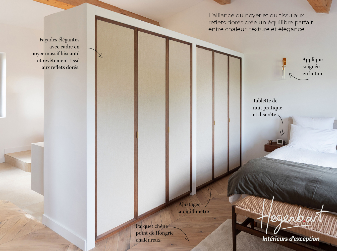 Un ensemble harmonieux mêlant bois précieux, tissus raffinés et détails en laiton, conçu entièrement sur mesure pour Monsieur et Madame.