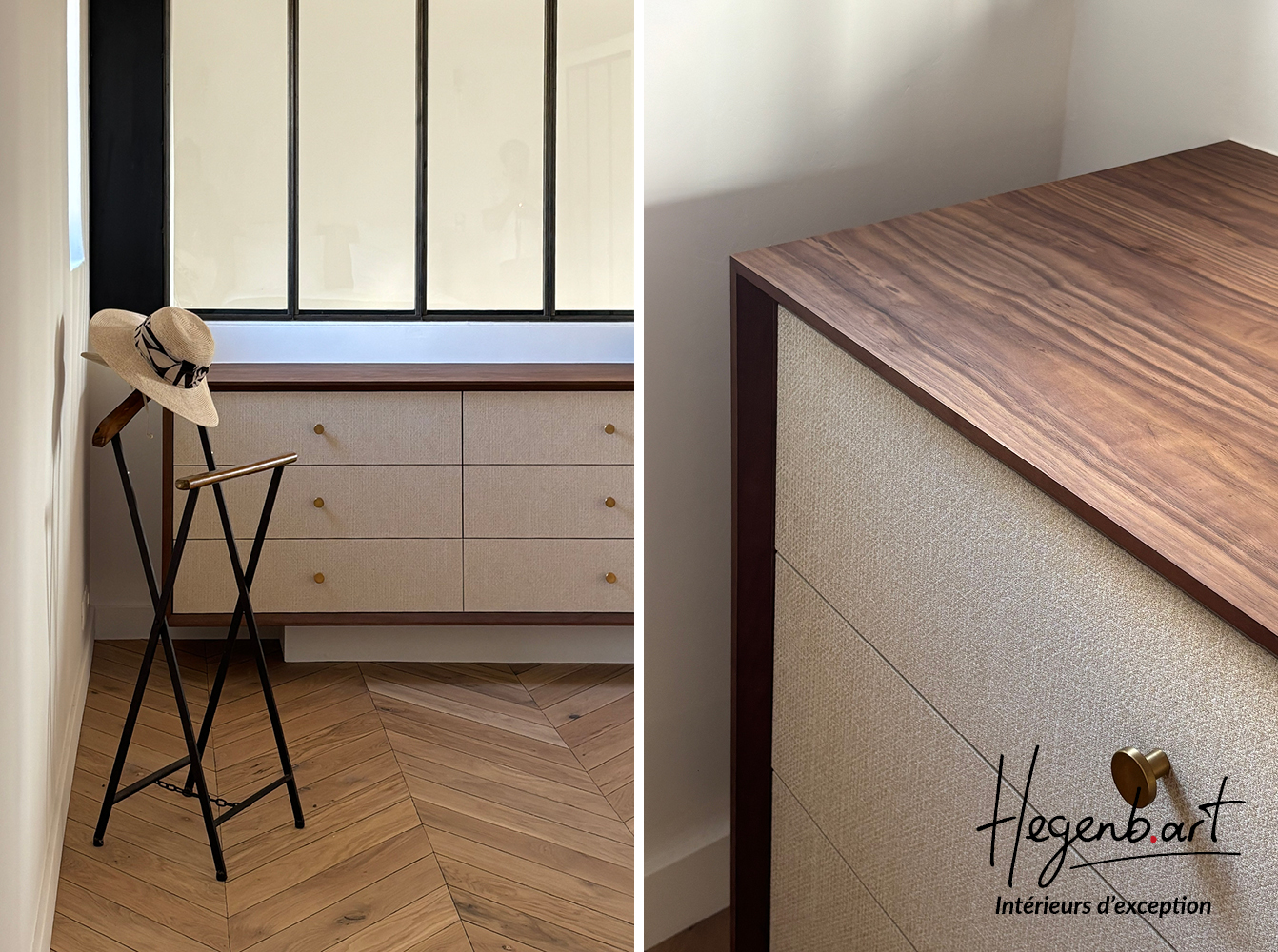 En complément du dressing, nous avons conçu une commode sur mesure de 3,50 mètres de long, composée de 12 tiroirs.