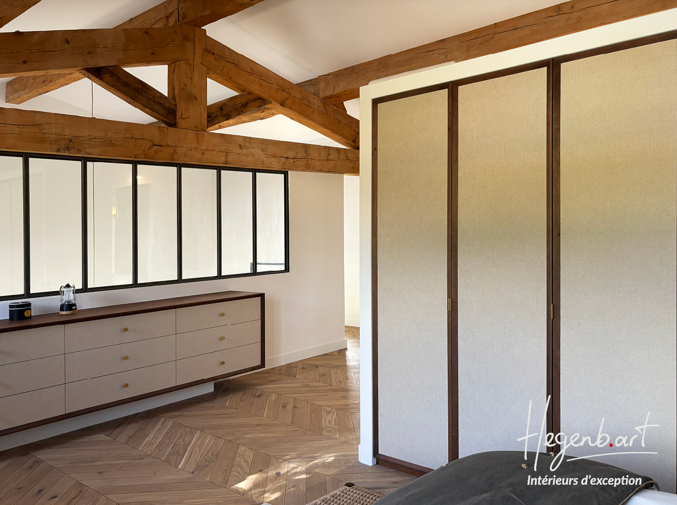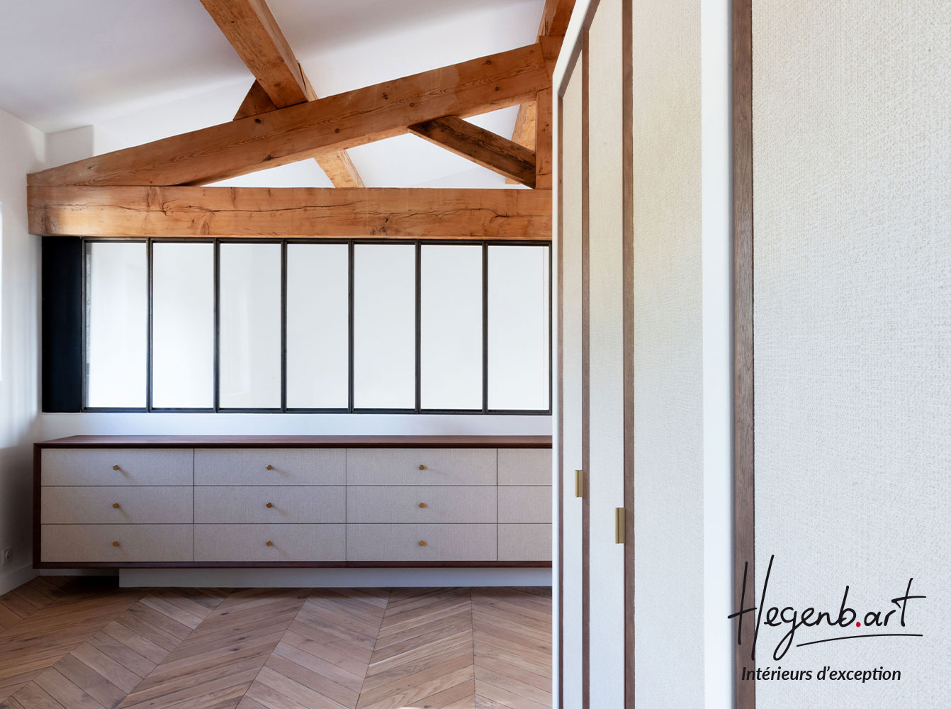 Avec ses 3m20 de long pour le dressing et 3m50 pour la commode, cet ensemble apporte à la pièce un caractère à la fois fonctionnel et majestueux.