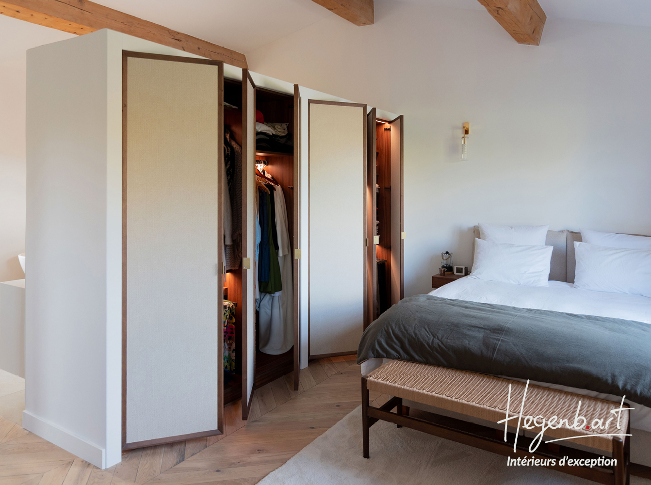 Élégance, fonctionnalité et savoir-faire artisanal : découvrez un dressing sur mesure haut de gamme réalisé pour une chambre parentale d’exception à Aix-en-Provence.