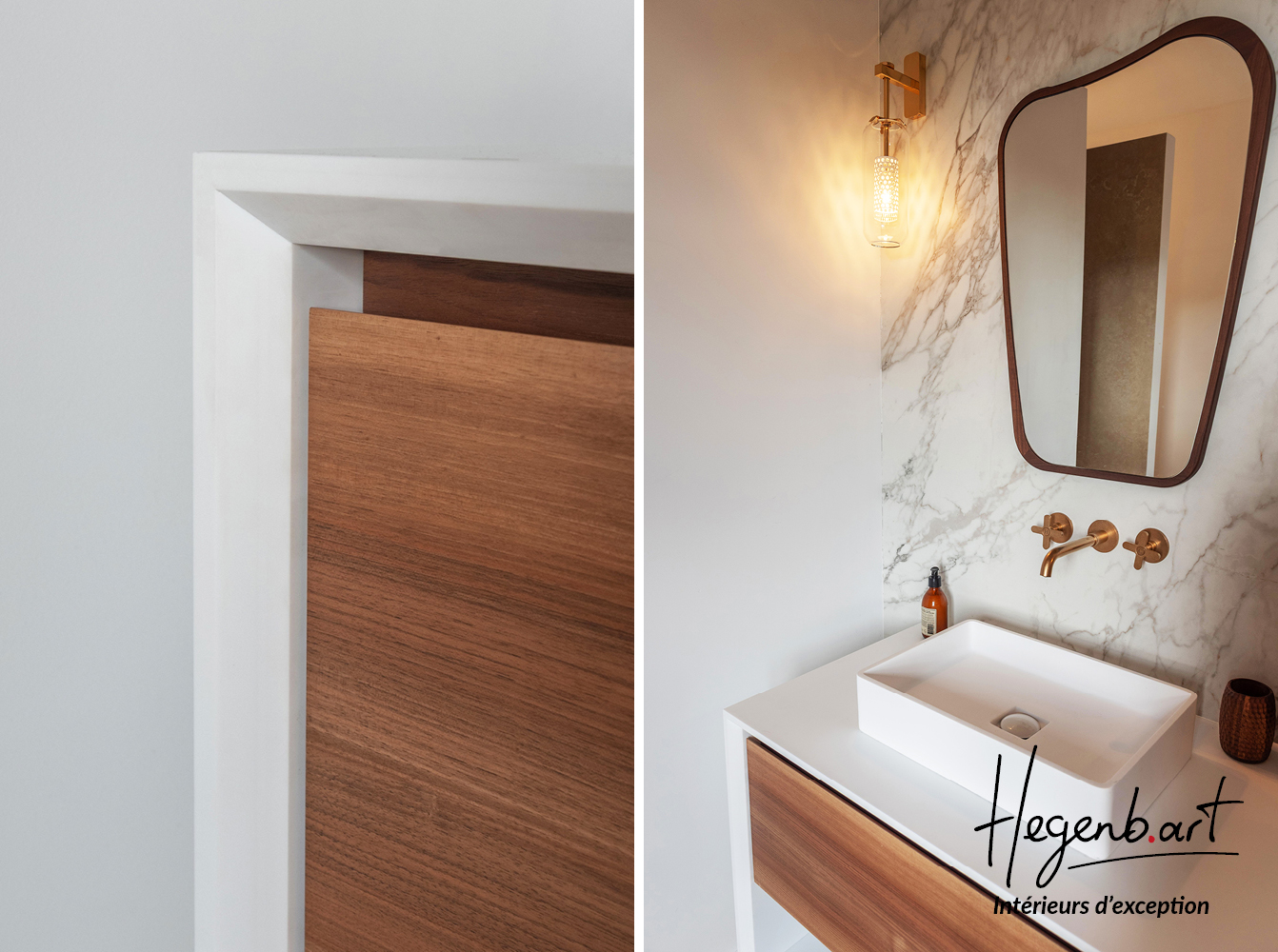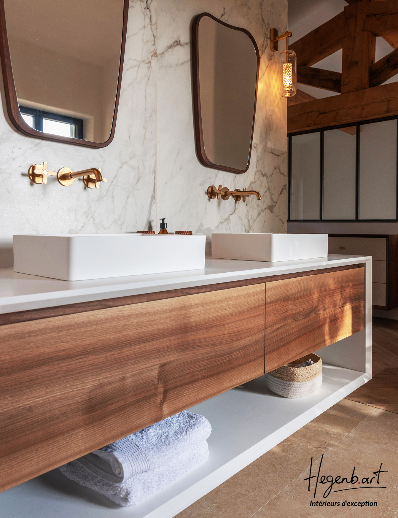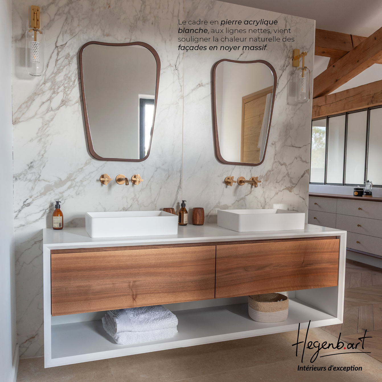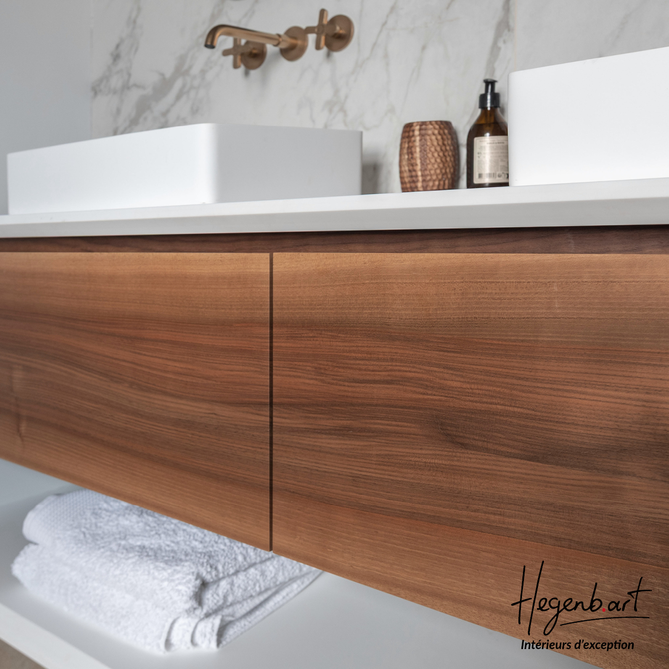Le cadre en pierre acrylique blanche himacs®, aux lignes nettes, vient souligner la chaleur naturelle des façades en noyer massif. Sous le meuble, un espace ouvert a été volontairement créé pour accueillir serviettes et accessoires, tout en conservant une impression de légèreté.
