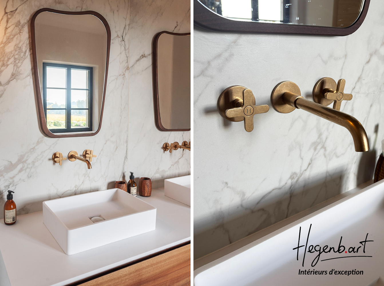 La robinetterie en laiton apporte une touche de caractère et dialogue avec les appliques Vadim de Sarah Lavoine, qui diffusent une lumière douce et chaleureuse. En fond, une grande plaque de céramique veinée gris beige habille le mur, offrant un rendu sophistiqué et harmonieux. Les deux miroirs organiques en noyer de Maison Sarah Lavoine, apportent de la douceur avec leurs lignes courbes.
