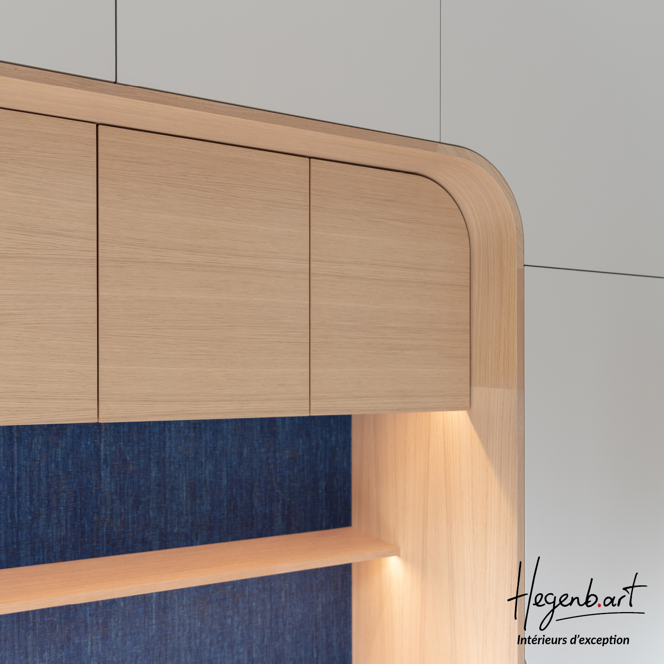 Au fond de la niche, nous avons posé un revêtement bleu cobalt en coton et soie filés à la main, signé Arte. Ce matériau haut de gamme apporte un confort acoustique en absorbant les sons, favorisant ainsi la concentration.