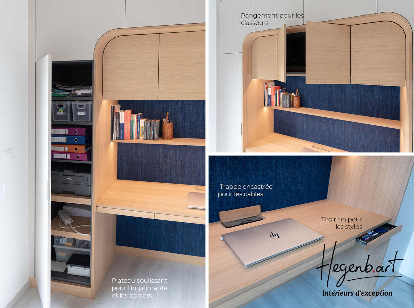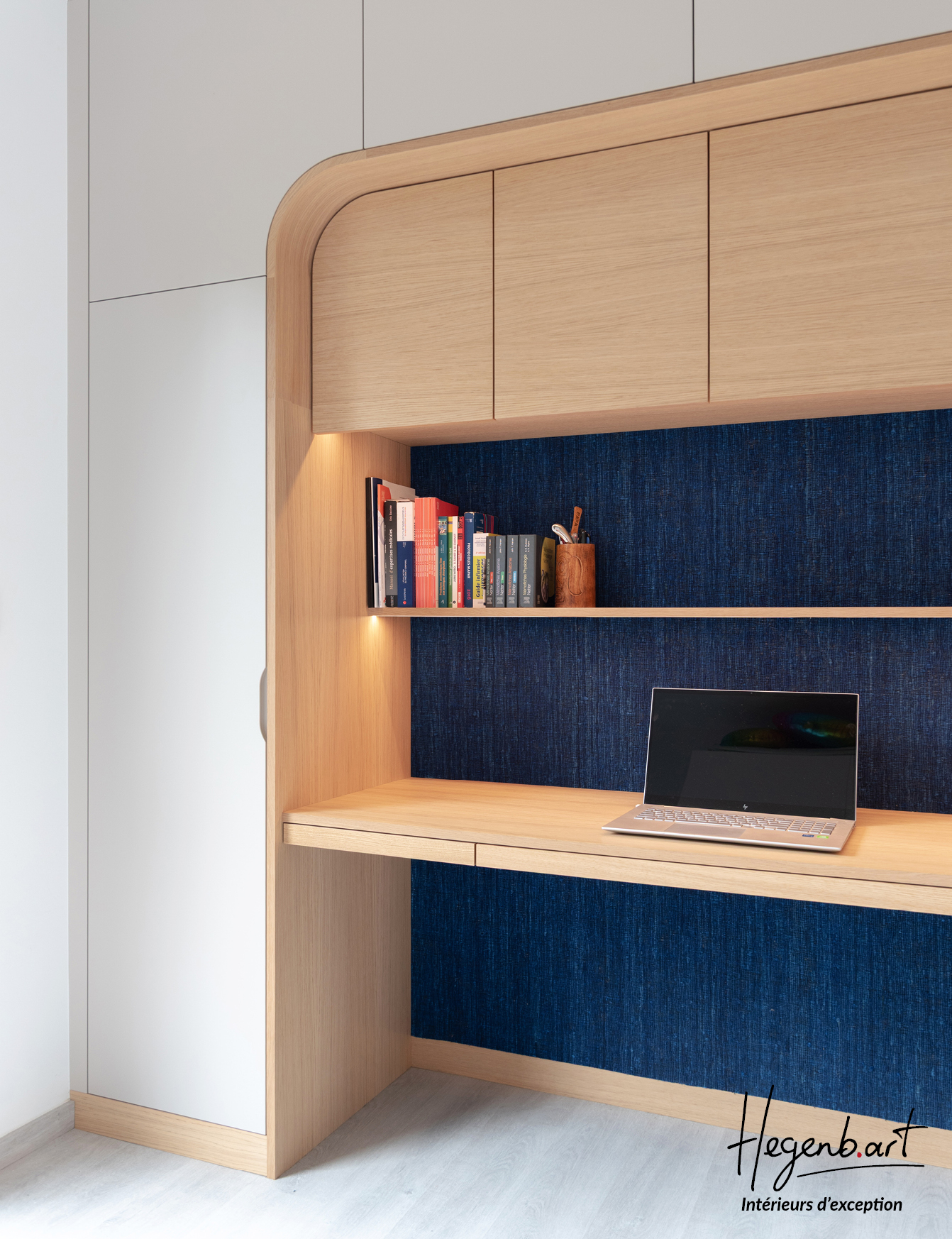 Le bureau est mis en valeur par un bandeau LED encastré sous une étagère suspendue en chêne. Celle-ci sert à exposer quelques objets décoratifs, des livres ou encore un pot à crayons. Au-dessus, des portes aux coins arrondis cachent avec élégance les classeurs et documents professionnels.