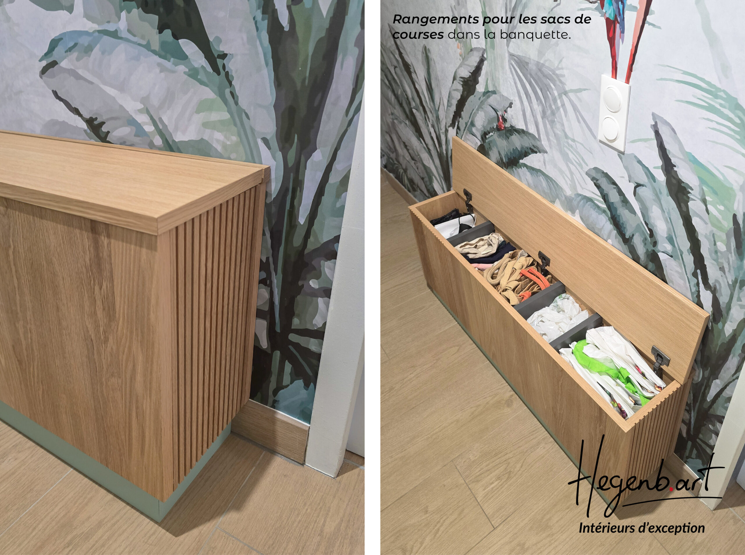 - Une banquette avec coffre intégré, idéale pour le rangement des sacs