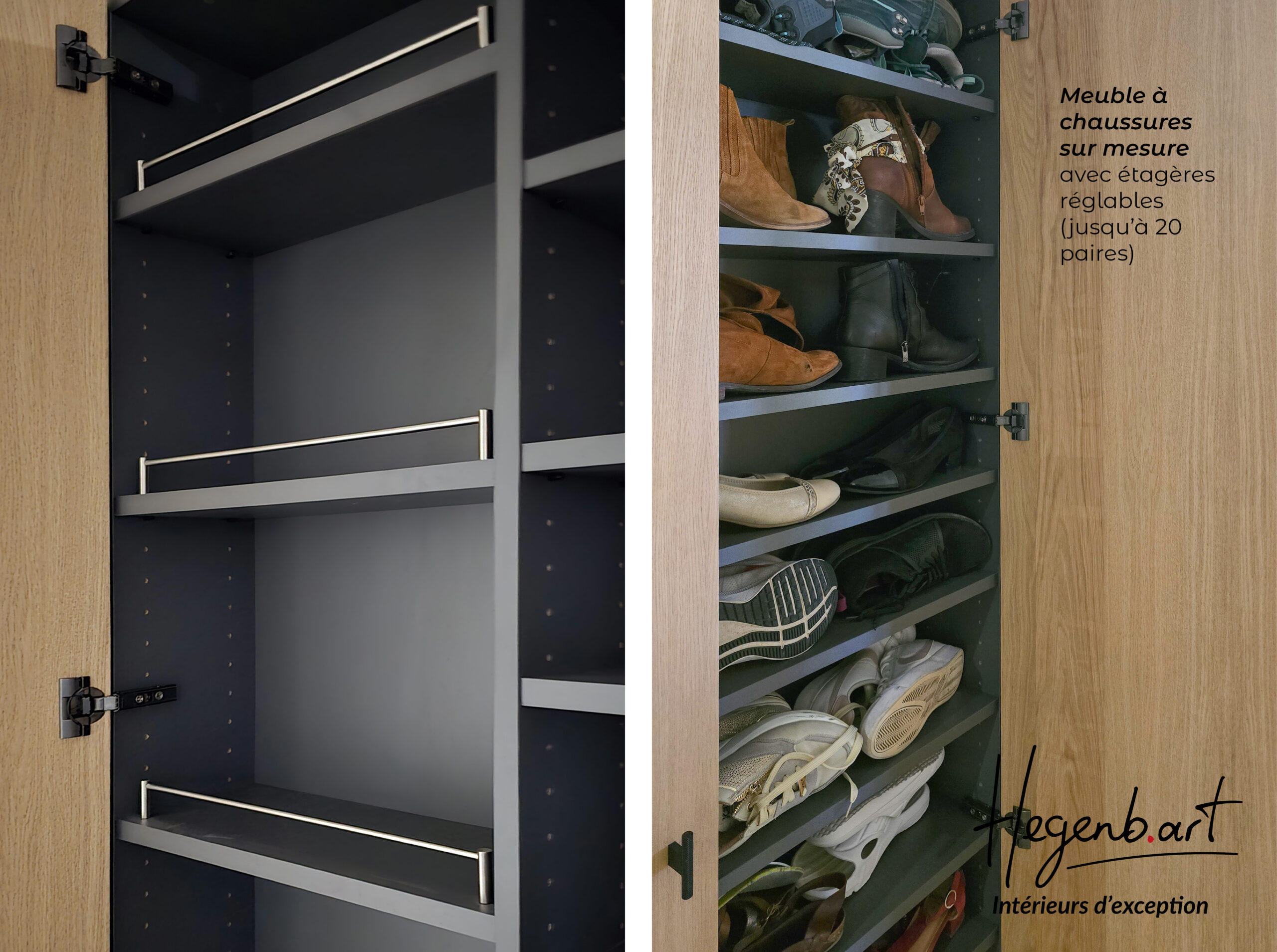 - Un meuble à chaussures sur mesure avec étagères réglables (jusqu’à 20 paires)