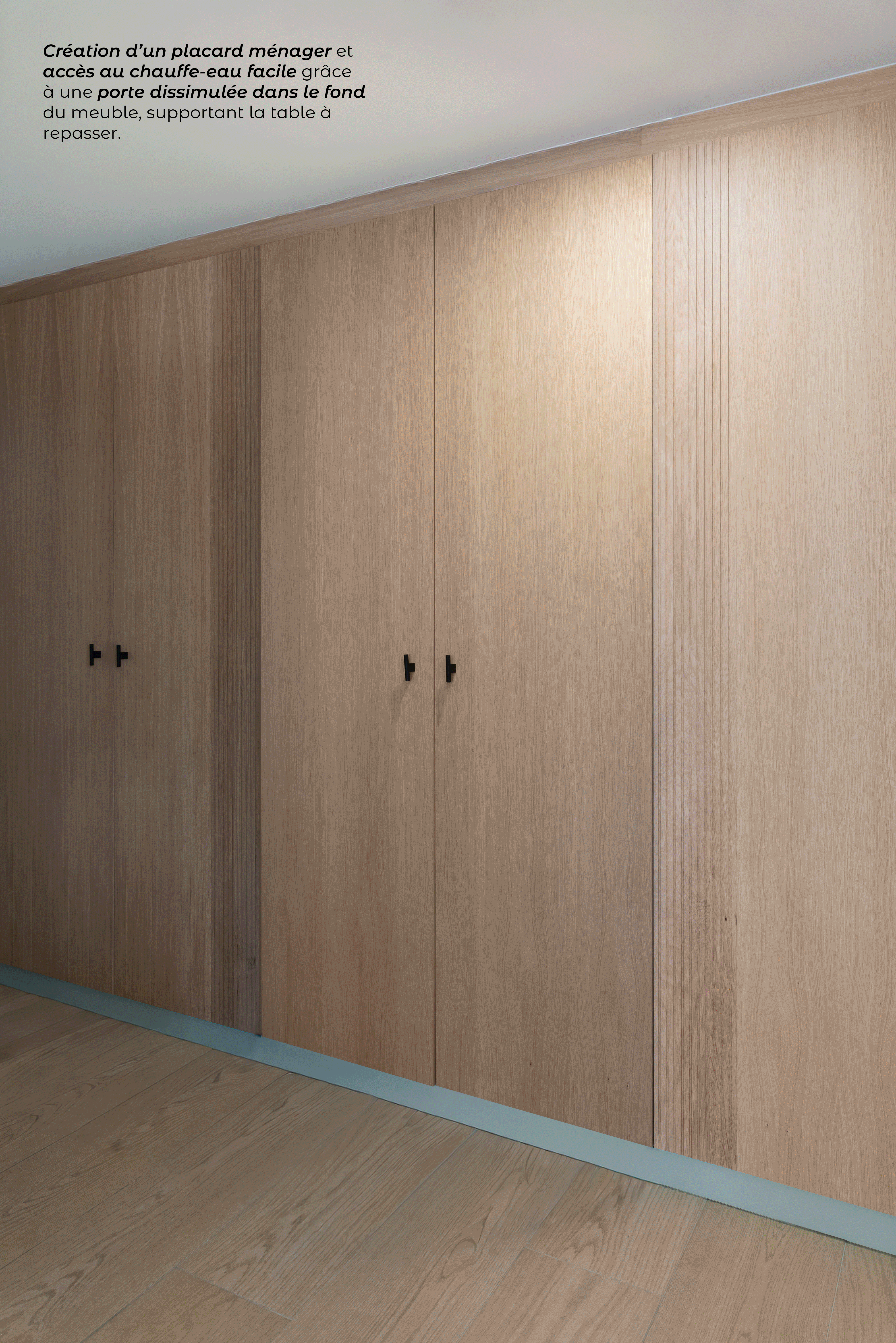 - Un placard ménager sur mesure dissimulant le chauffe-eau, avec accès technique et rangements dédiés (produits ménagers, étendoir, balai…)