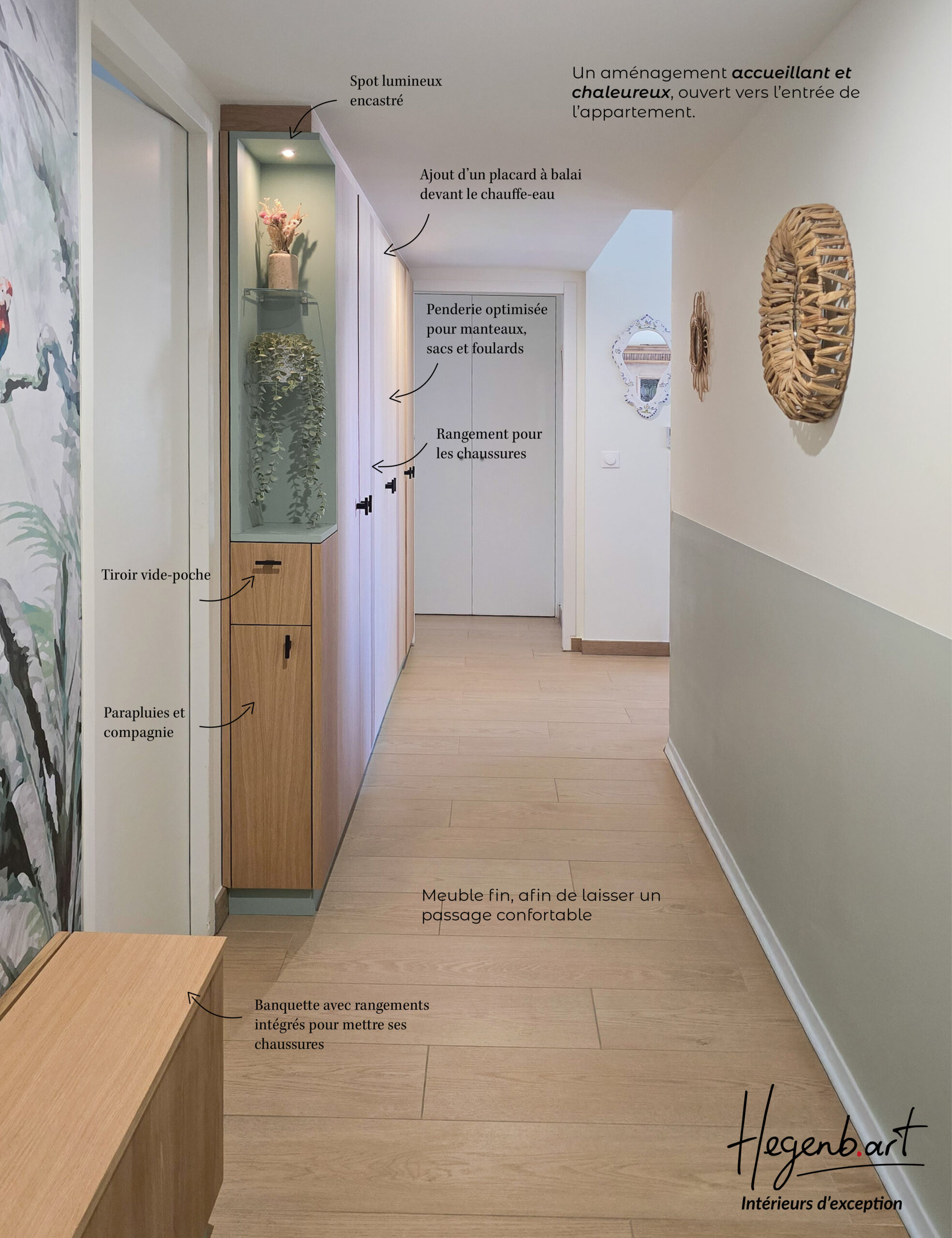Objectif : créer une entrée pratique, esthétique et chaleureuse, facilitant la circulation, sans dépasser 20 cm de profondeur, tout en intégrant un espace technique pour le chauffe-eau.