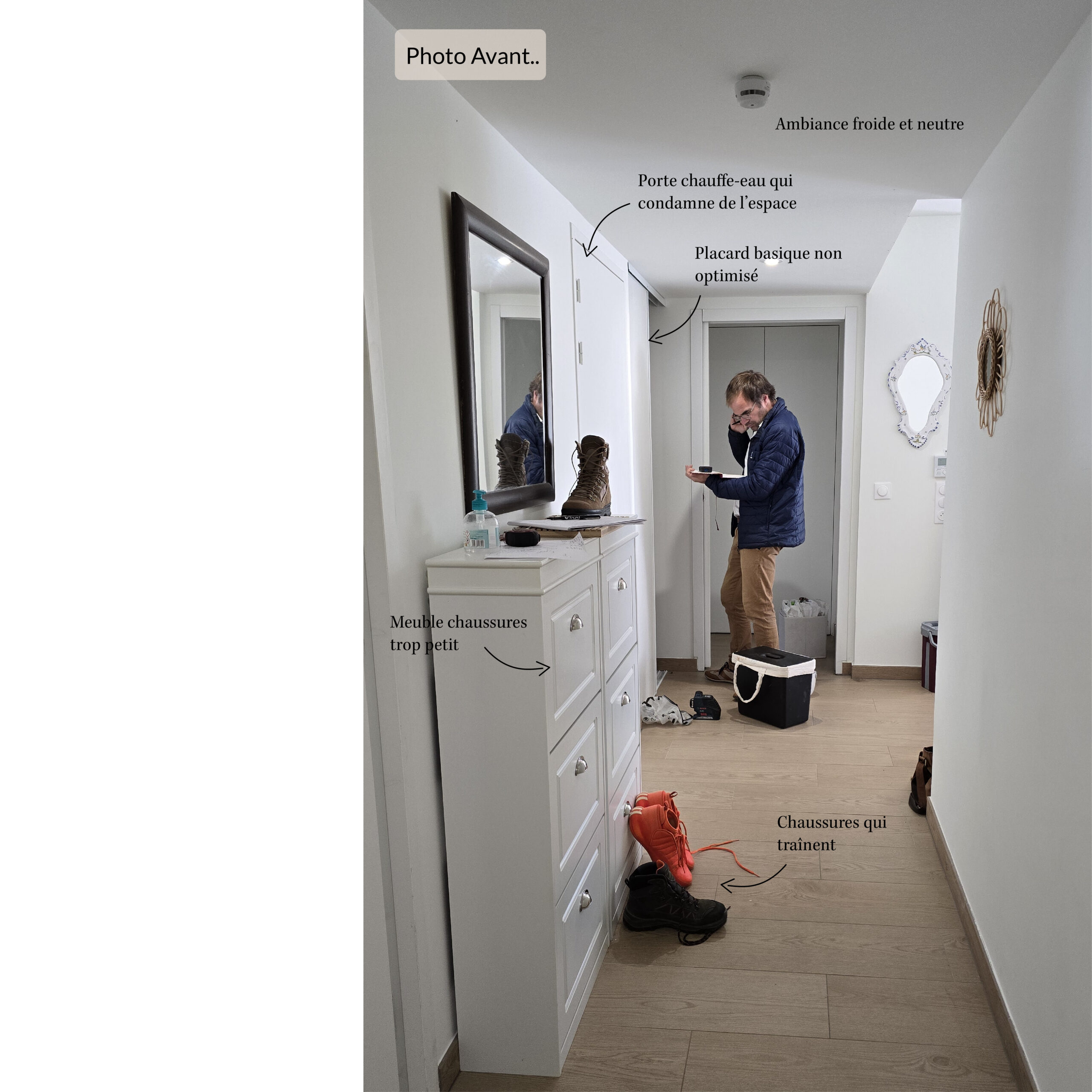 Dans ce projet d’aménagement d’entrée sur mesure, notre cliente faisait face à un couloir étroit difficile à exploiter. Le mobilier existant, peu qualitatif, ne permettait pas un rangement d’entrée fonctionnel : chaussures visibles, manque de place pour les sacs, absence de banquette…