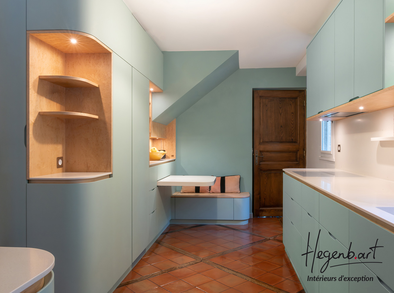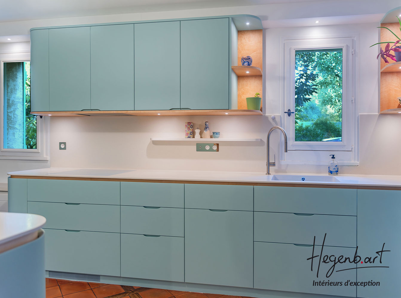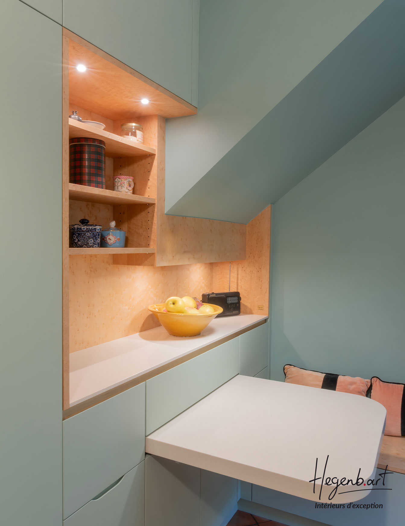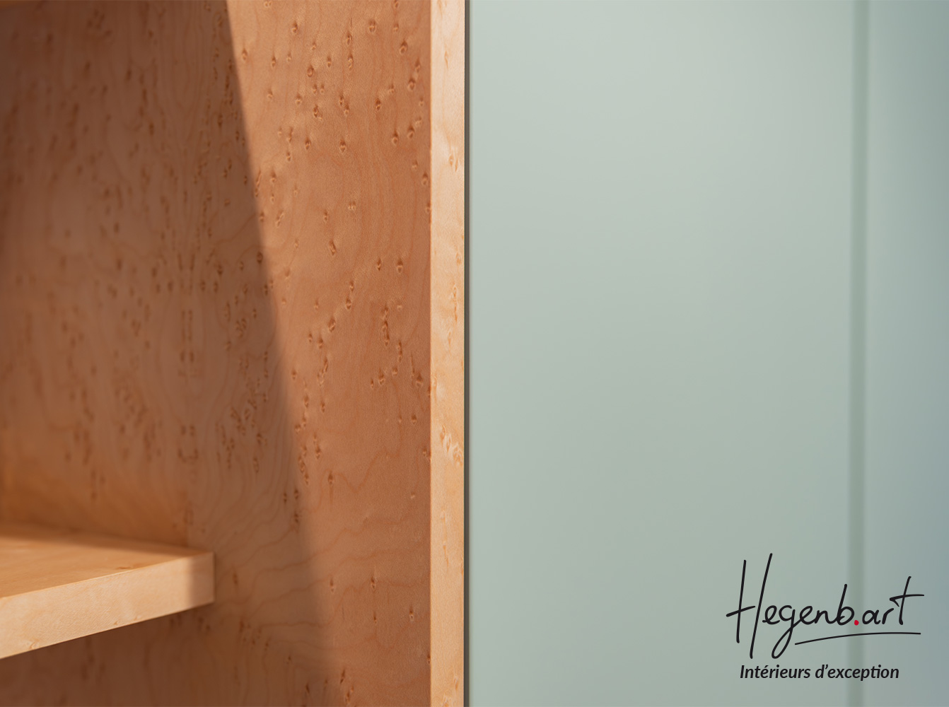 Côté esthétique, nos clients souhaitaient une ambiance lumineuse, originale et empreinte de fantaisie. Nous avons donc proposé un mélange de bois clair en érable moucheté – doux et raffiné – et de laque bleu-vert pour une touche de fraîcheur et d’originalité.