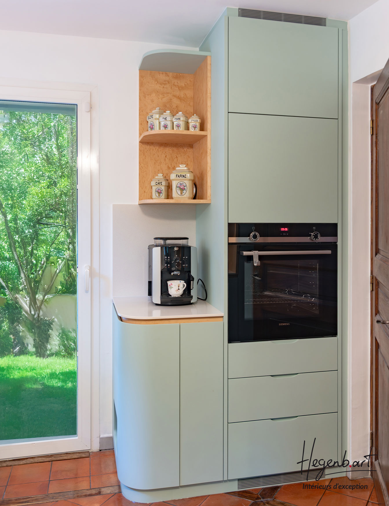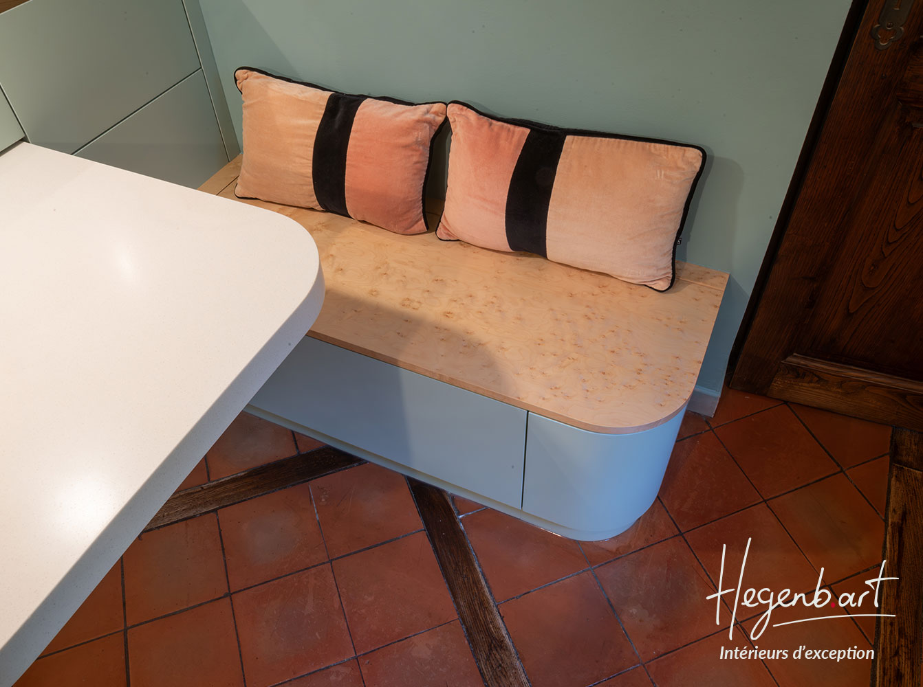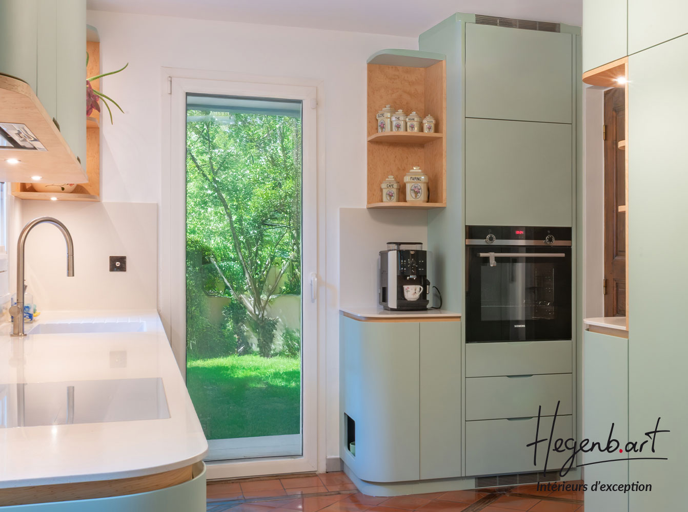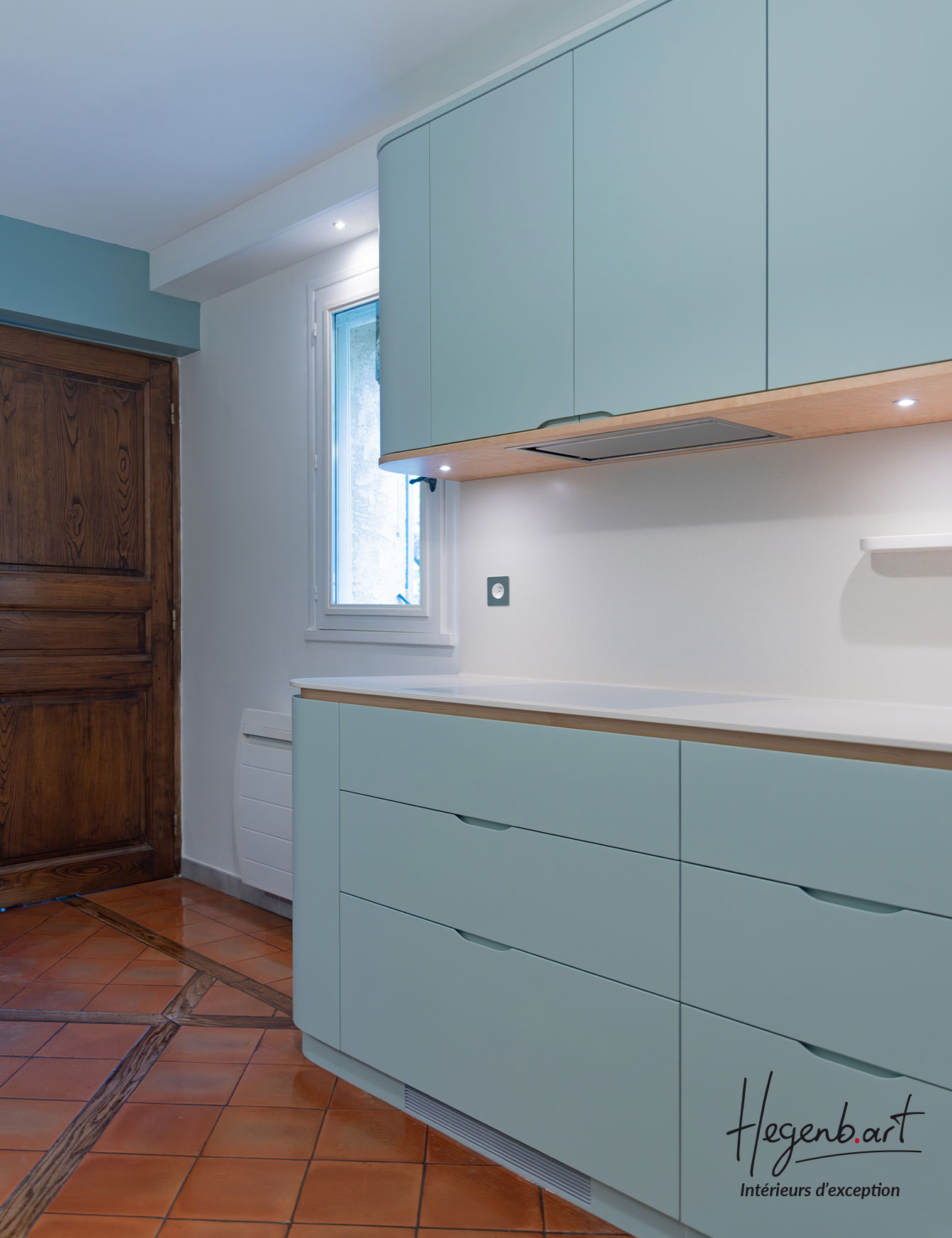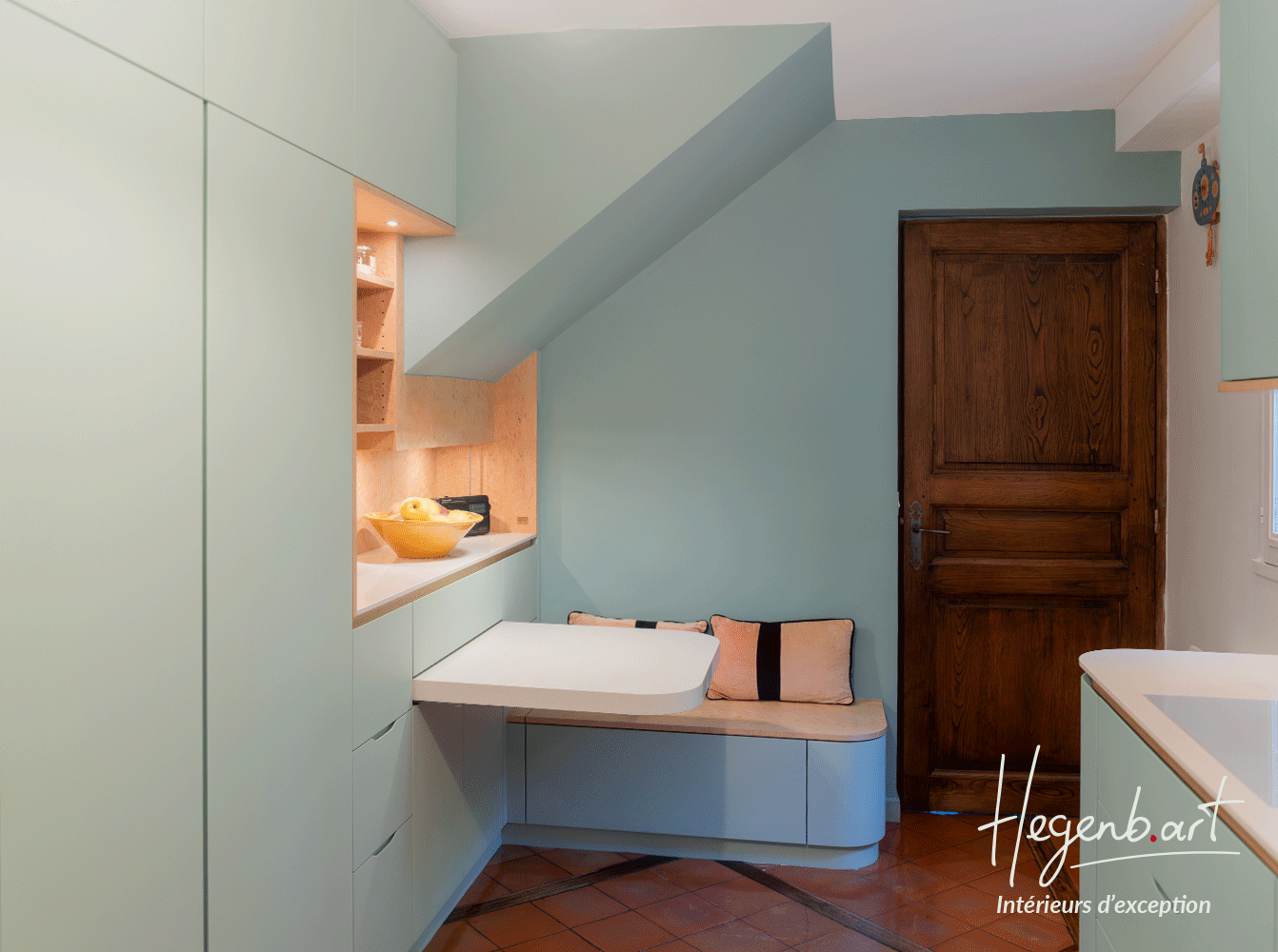 Côté esthétique, nos clients souhaitaient une ambiance lumineuse, originale et empreinte de fantaisie. Nous avons donc proposé un mélange de bois clair en érable moucheté – doux et raffiné – et de laque bleu-vert pour une touche de fraîcheur et d’originalité.