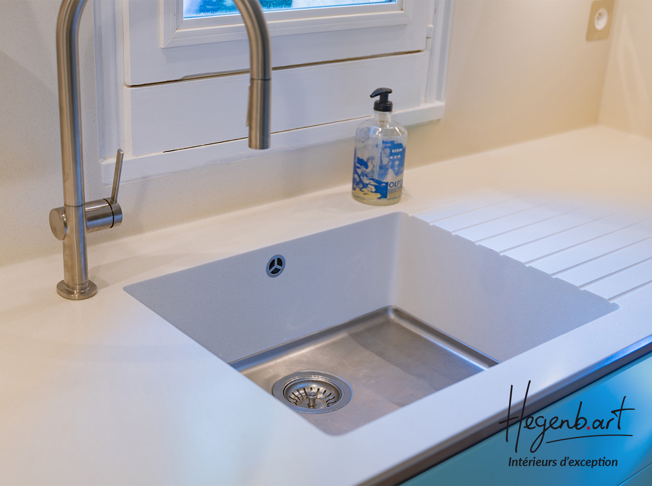 Le plan de travail en pierre acrylique Himacs complète l’ensemble : ce matériau non poreux est à la fois élégant, très résistant et facile d’entretien.